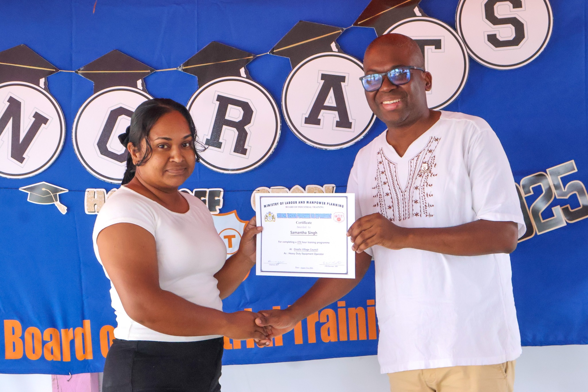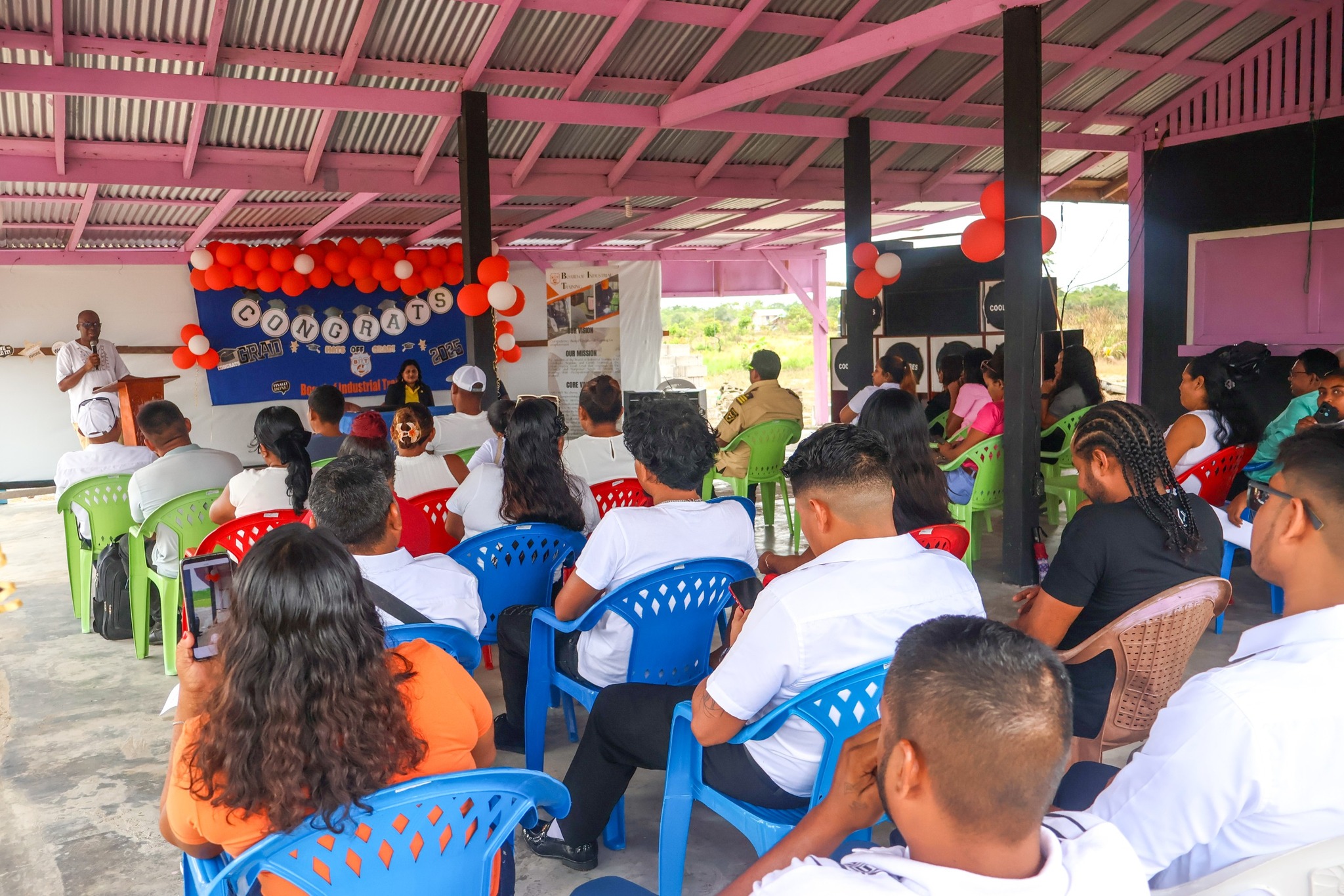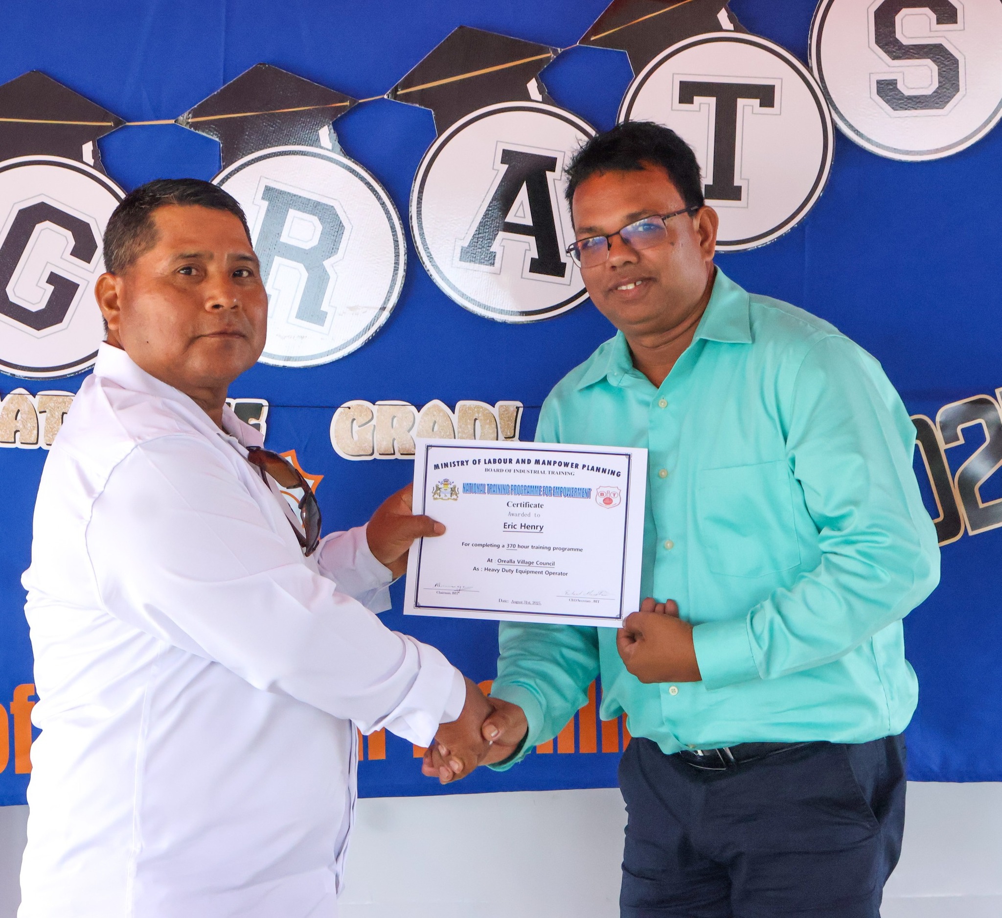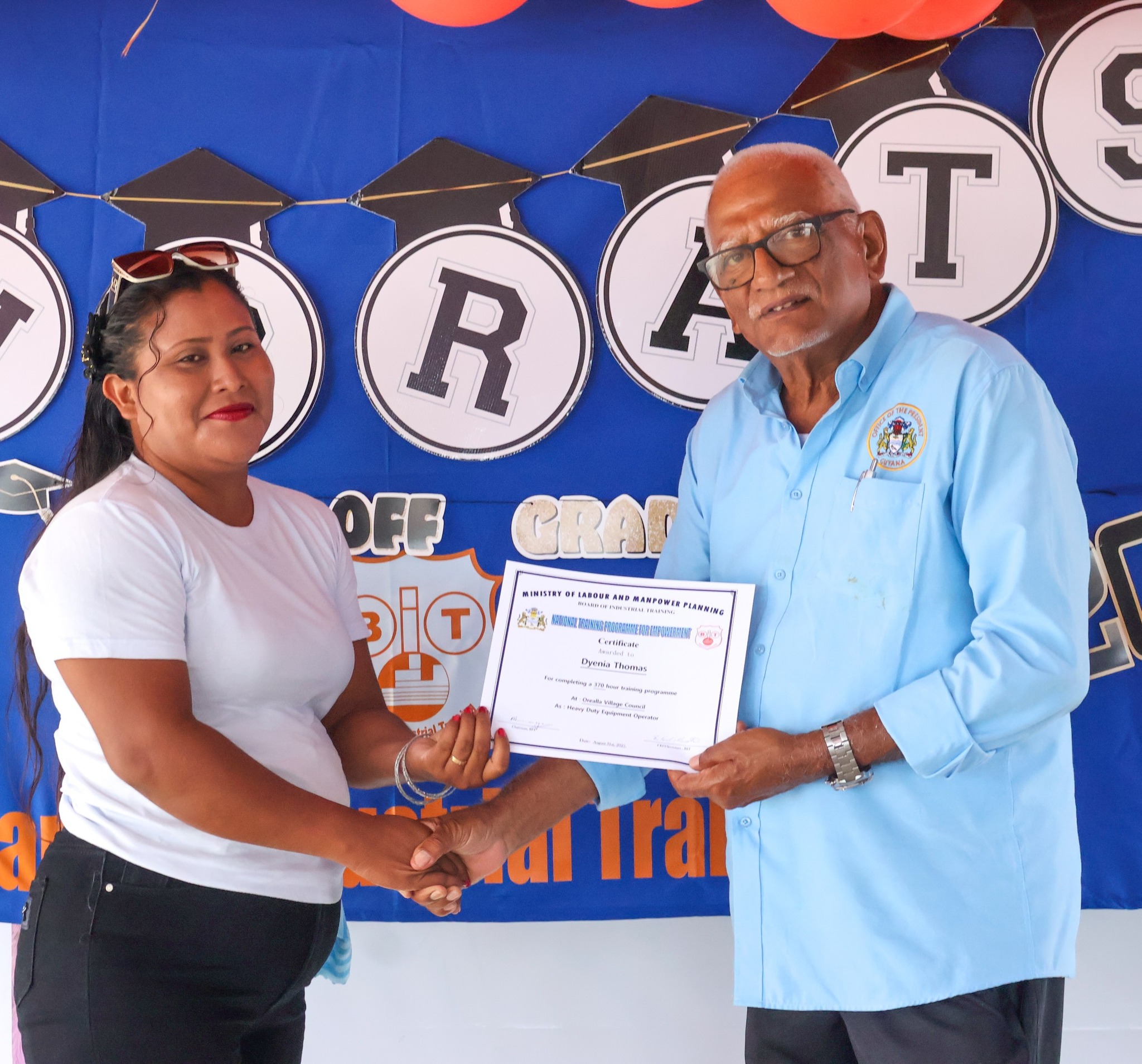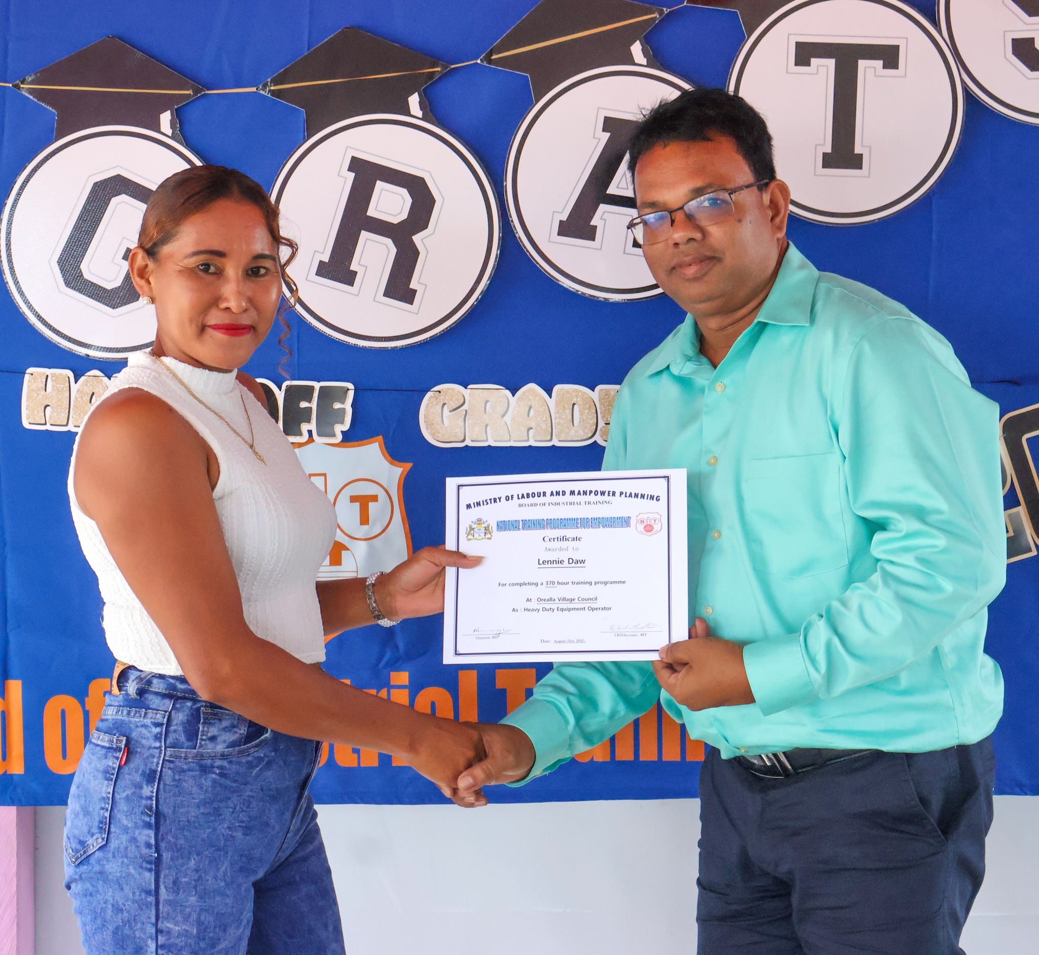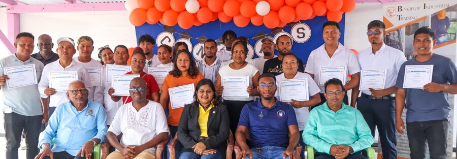 The graduation ceremony on Tuesday, November 18, 2025, was attended by Permanent Secretary of the Ministry of Labour and Manpower Planning, Ms Indrani Ramnarine; BIT CEO, Mr Richard Maughn; Board Members, Mr Jainarine Sookpaul and Professor Clement Sankat; Orealla Toshao, Mr Laurence Vandenburg; Siparuta Senior Councillor, Mr Neil Wong; Technical Officers, Mr Clarence Shako and Ms Rowena Dejonge; Human Resources Clerk, Ms Adelicia Andries; and other officials.
