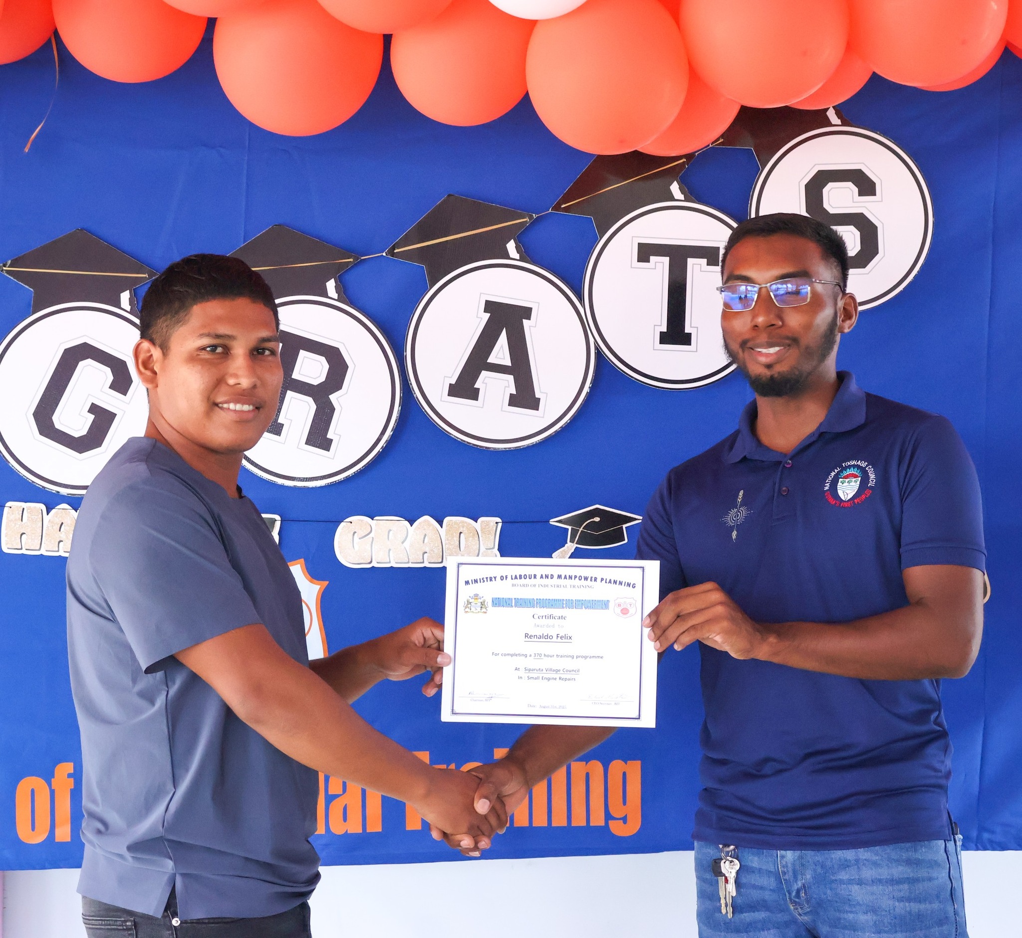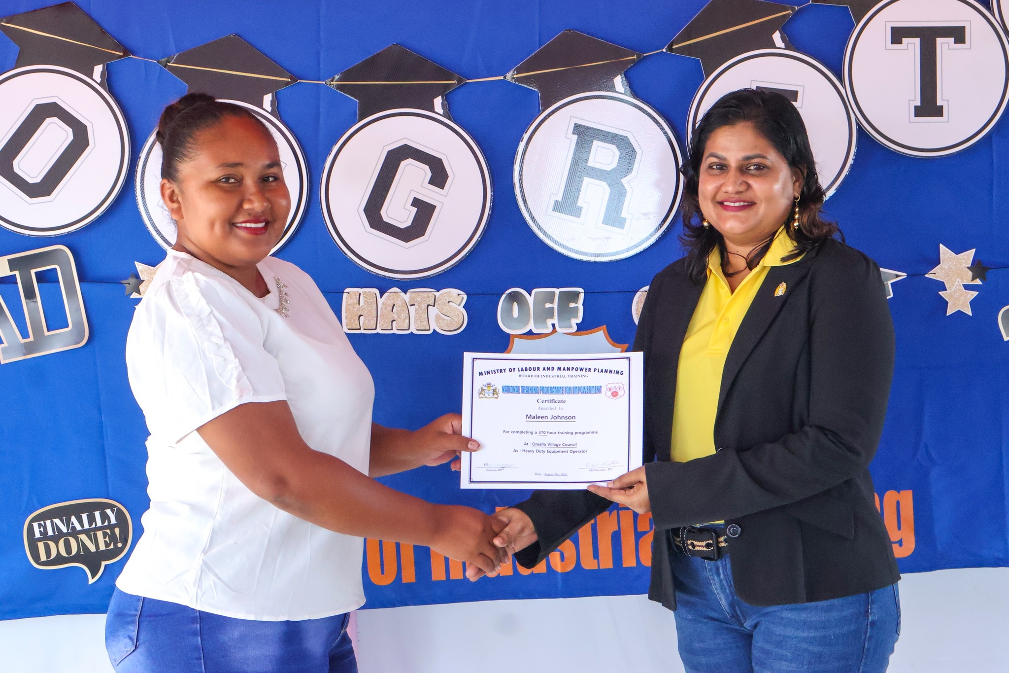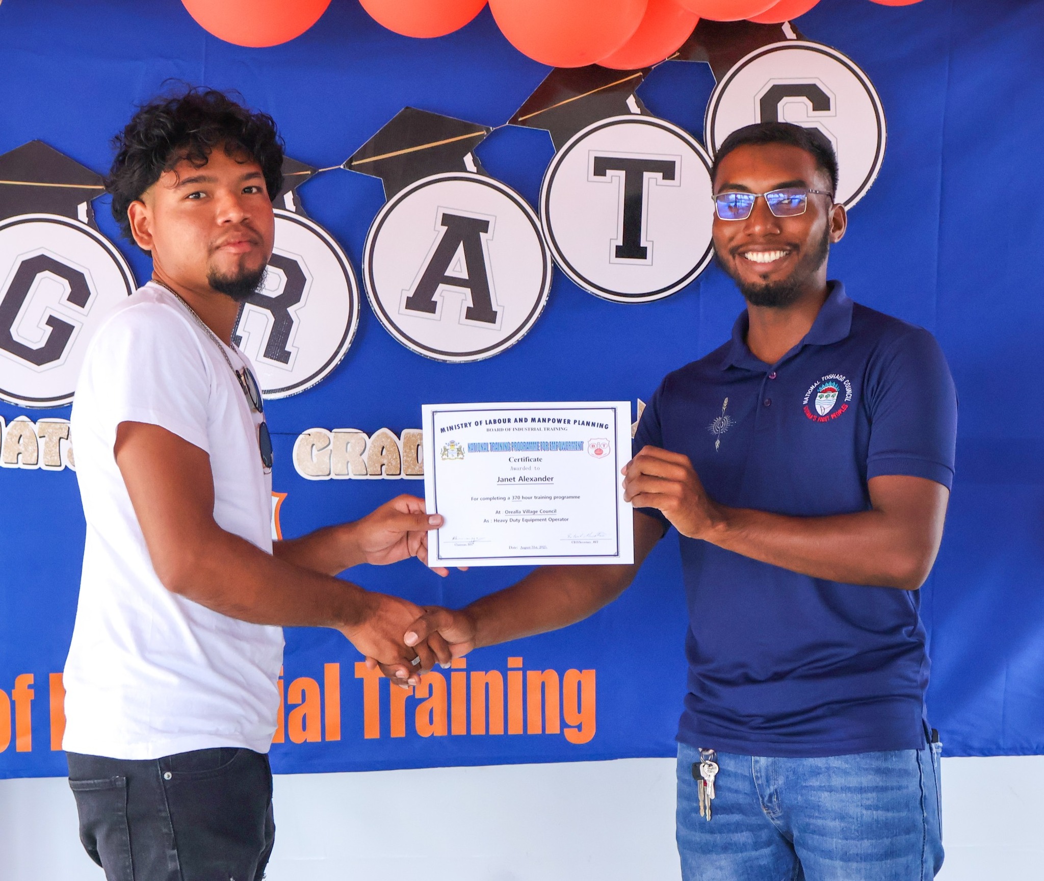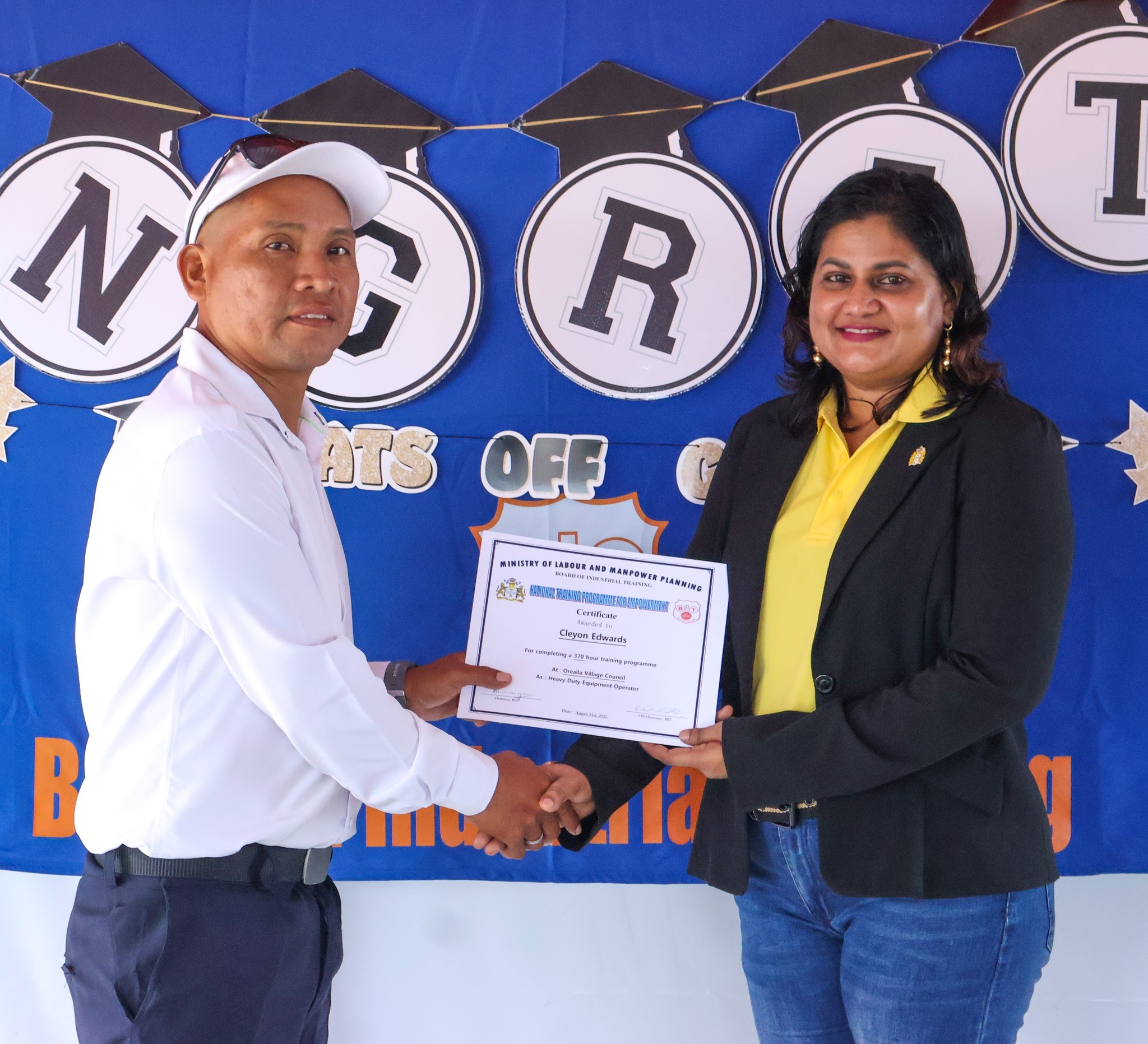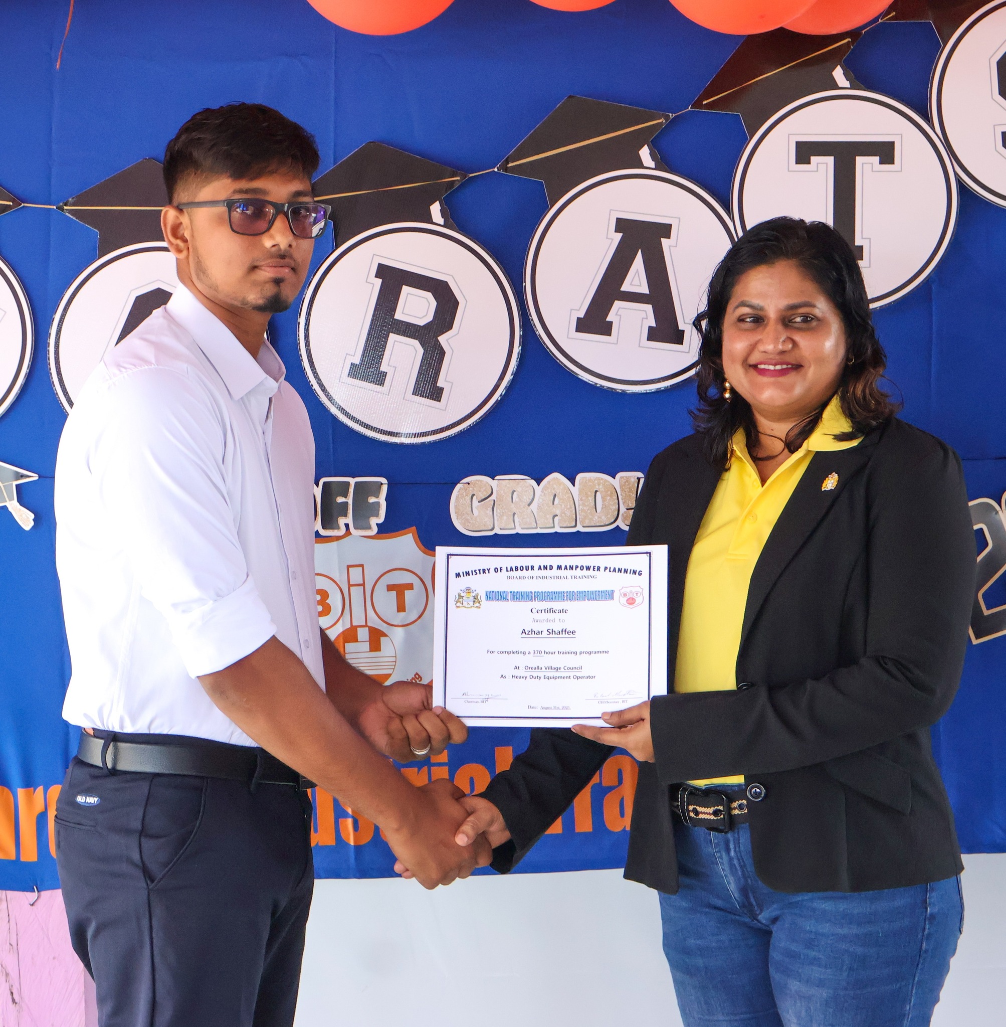 The graduation ceremony on Tuesday, November 18, 2025, was attended by Permanent Secretary of the Ministry of Labour and Manpower Planning, Ms Indrani Ramnarine; BIT CEO, Mr Richard Maughn; Board Members, Mr Jainarine Sookpaul and Professor Clement Sankat; Orealla Toshao, Mr Laurence Vandenburg; Siparuta Senior Councillor, Mr Neil Wong; Technical Officers, Mr Clarence Shako and Ms Rowena Dejonge; Human Resources Clerk, Ms Adelicia Andries; and other officials.