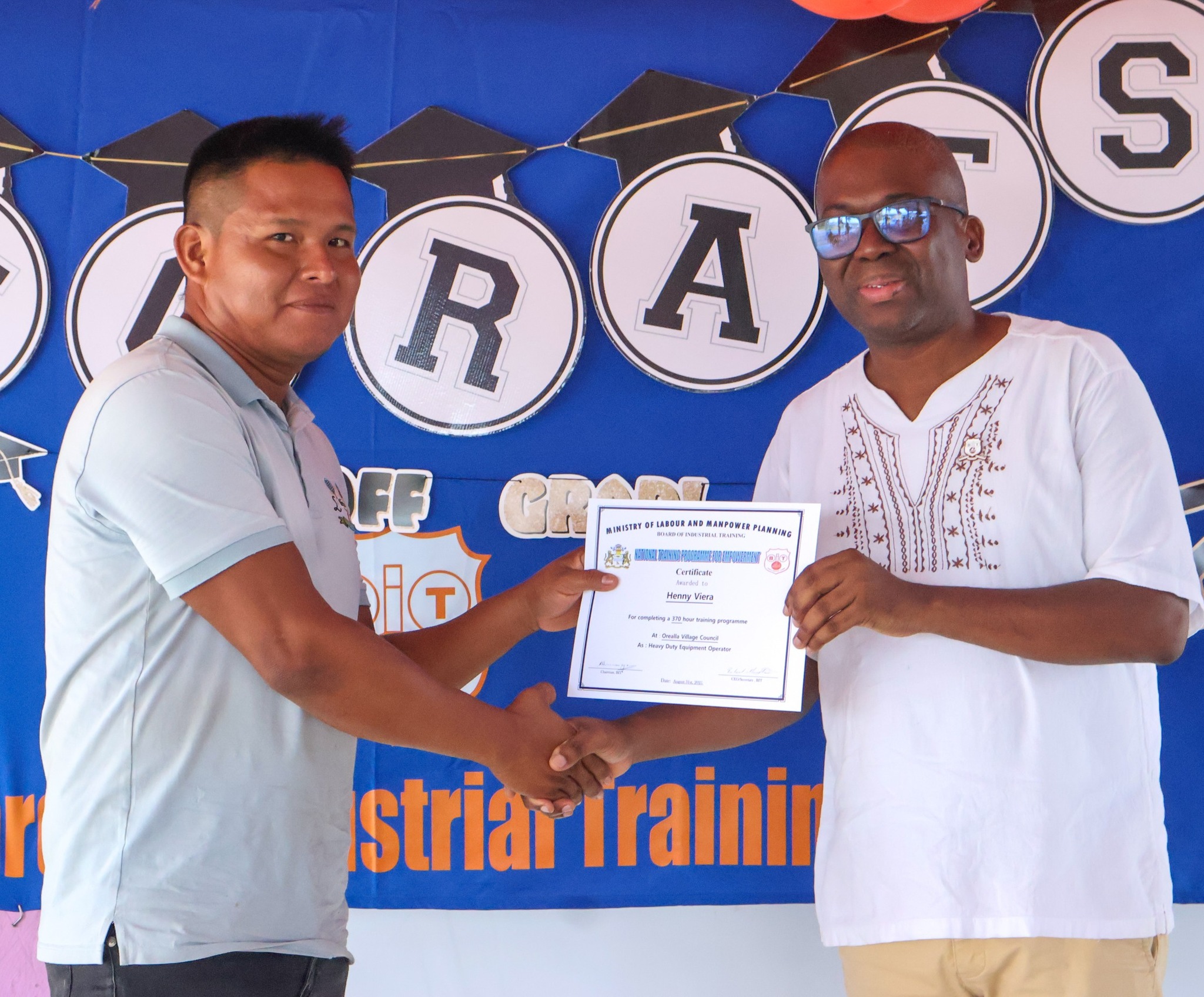 Thirty-five residents of Orealla are now certified in Small Engine Repairs and Tractor/Heavy-Duty Equipment Operation through the Board of Industrial Training (BIT).